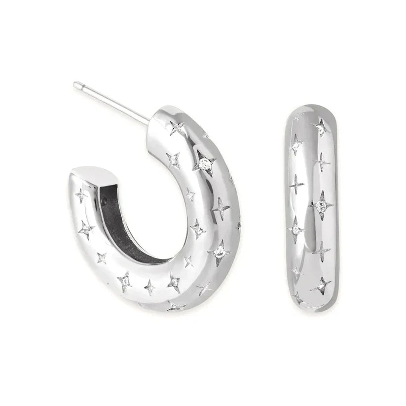 Kosmiset renkaat on koristeltu säihkeillä renkailla, joissa on herkkiä tähdenmuotoisia yksityiskohtia, jotka lisäävät hienovaraista taivaallista säihkettä. Modernit mutta ajattomat, ne tuovat avaruuden kosketuksen päivittäiseen elämääsi.